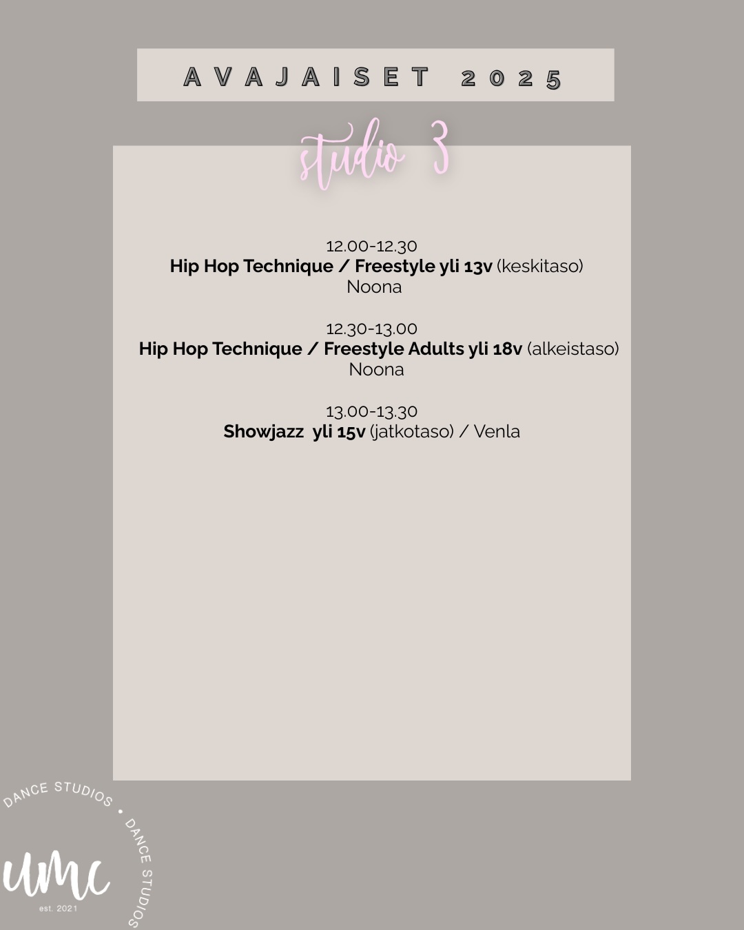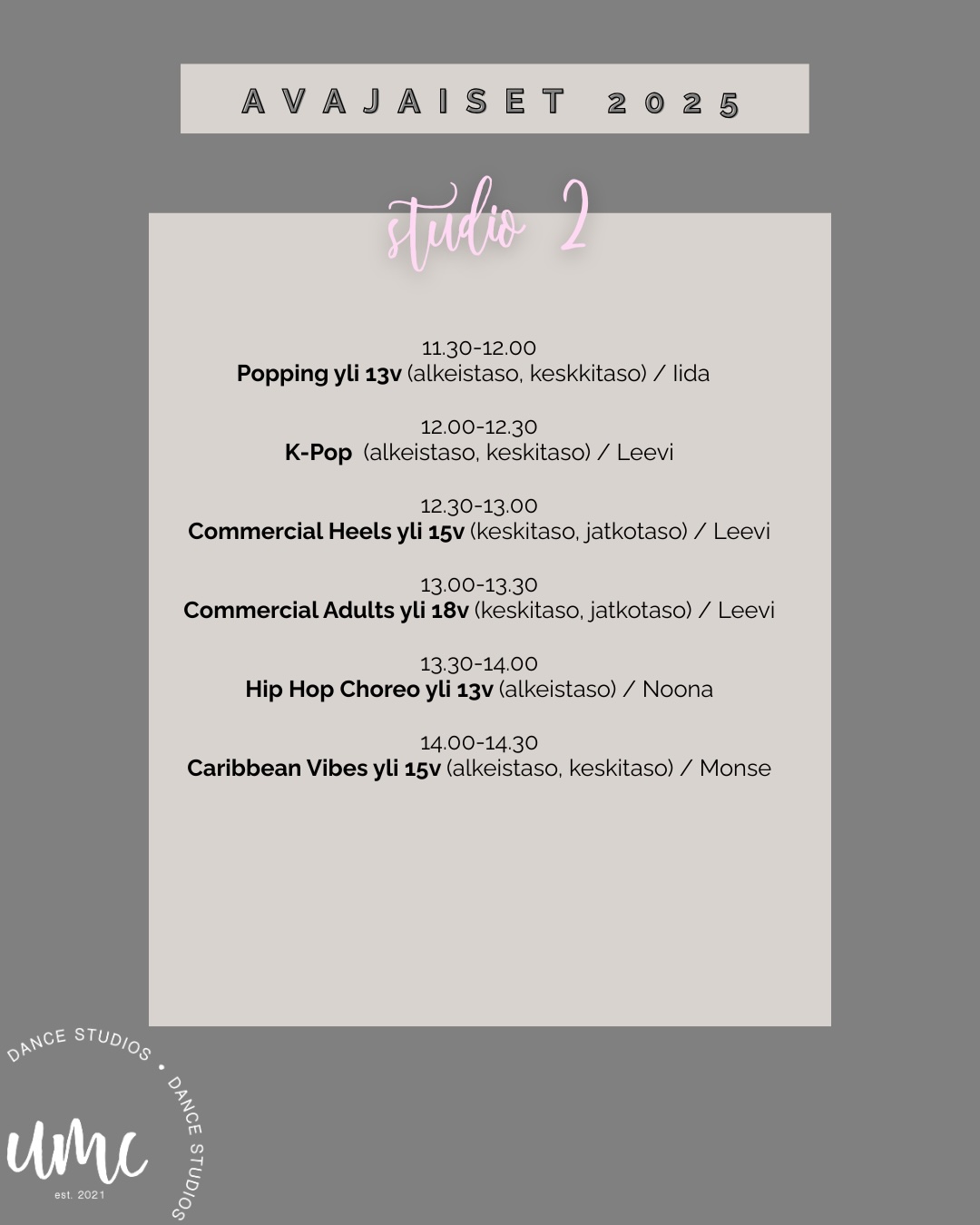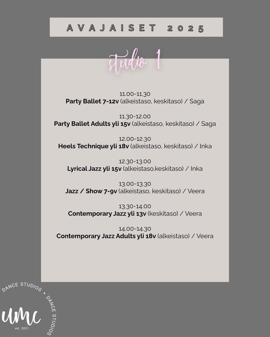 Tervetuloa starttaamaan kevätkausi UMC:lle avajaistapahtuman merkeissä! Tapahtuma on ilmainen ja kaikille avoin. Tämä on täydellinen tilaisuus tulla tutustumaan UMC:hen, testata tanssitunteja maksutta ja viettää sunnuntaita tanssin parissa. ✨ Luvassa ilmaisia kokeilutunteja eri lajeista – tule löytämään oma suosikkisi ja fiilistelemään kevätkauden starttia! Avajaisten tanssitunneille ei tarvitse ilmoittautua etukäteen.