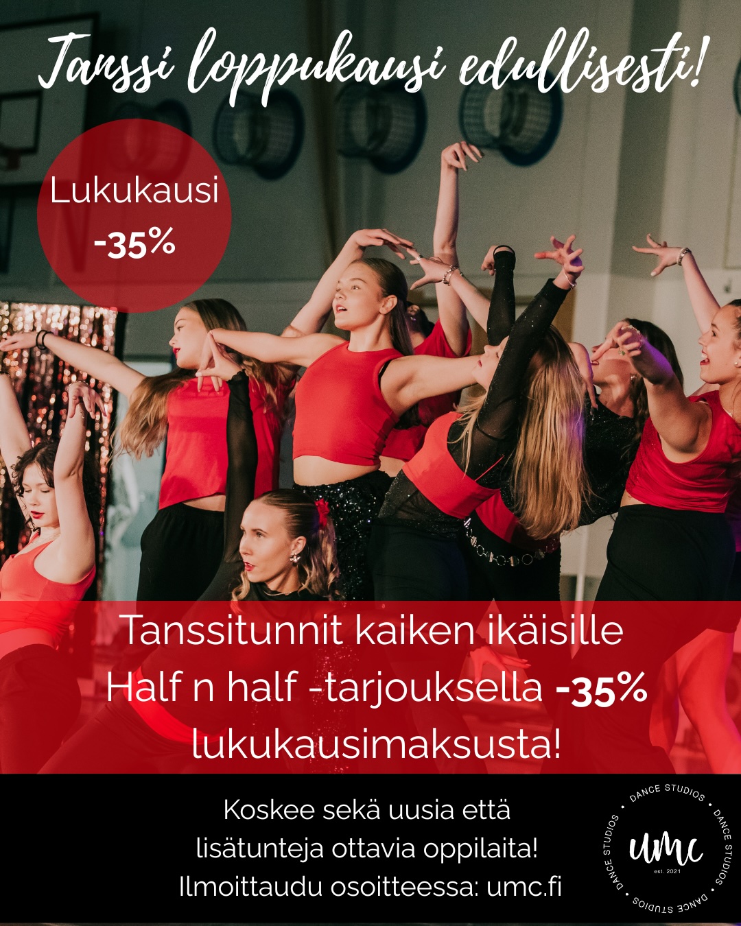 Nyt kaikki tanssitunnit kaiken ikäisille -35 % lukukausimaksusta Half n half -tarjouksella! 🔥